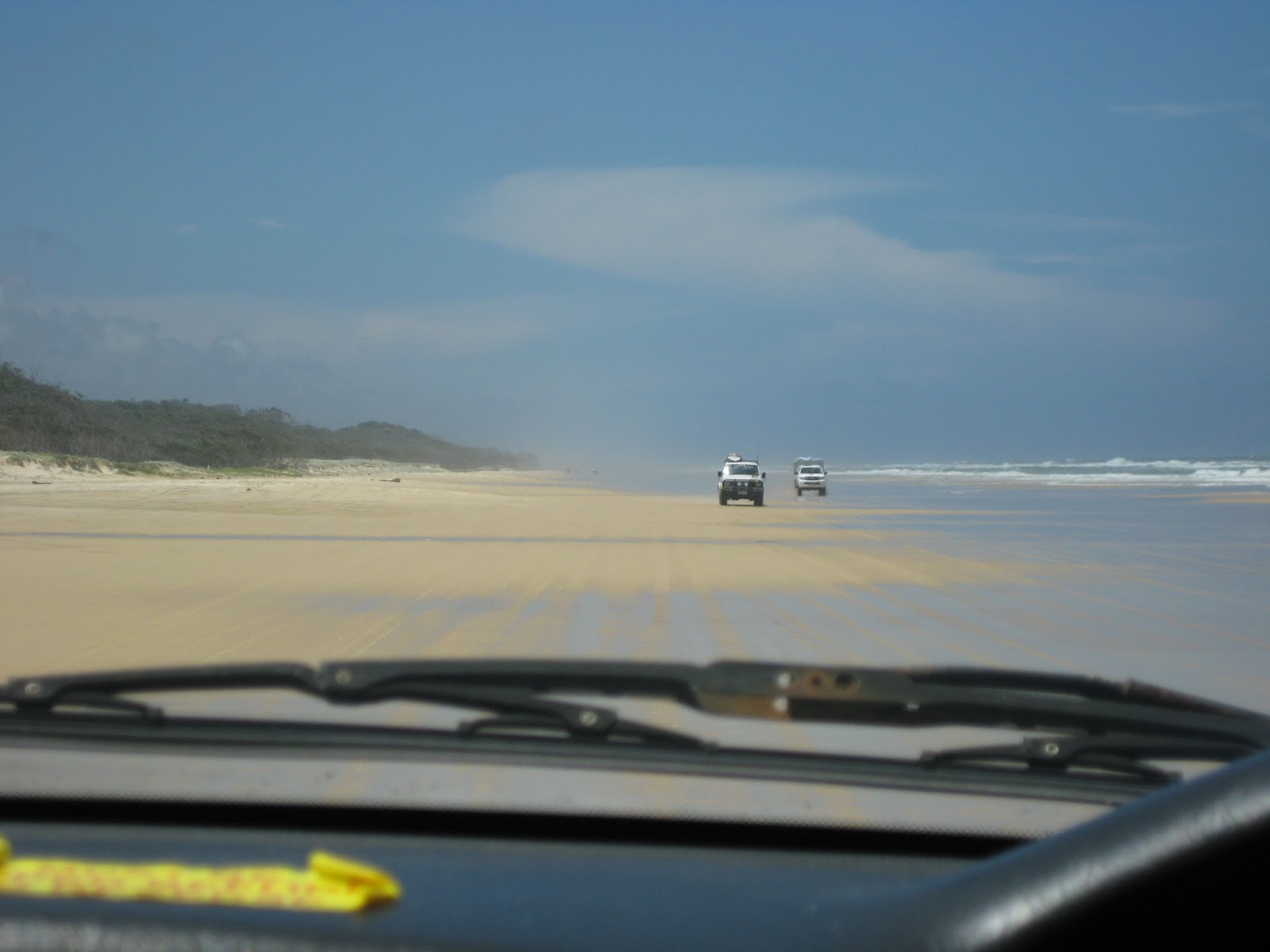 Vaknade en timme för tidigt, alltså klockan fyra, eftersom jag glömt ställa tillbaka min klocka. Tyckte allt det var lite mörkt när jag gick upp. Lyckades dock somna om och gick upp närmare klockan sex igen. Vi tog en taxi till Aussie Trax där vi bokat jeep och campingutrustning. Fick kolla på en informationsfilm om regler och säkerhet innan vi fick bilen och tutade iväg till färjeläget. Väntade ett tag och spanade på en död sköldpadda som flöt i vattenbrynet. Sen backade vi på färjan och gick upp på däck där vi låg och solade tills vi var framme på Fraser Island, som är världens största sandö och helt annorlunda från vad jag hade föreställt mig. Nästan hela ön är täckt av tropisk regnskog och vägarna är extremt skumpiga.